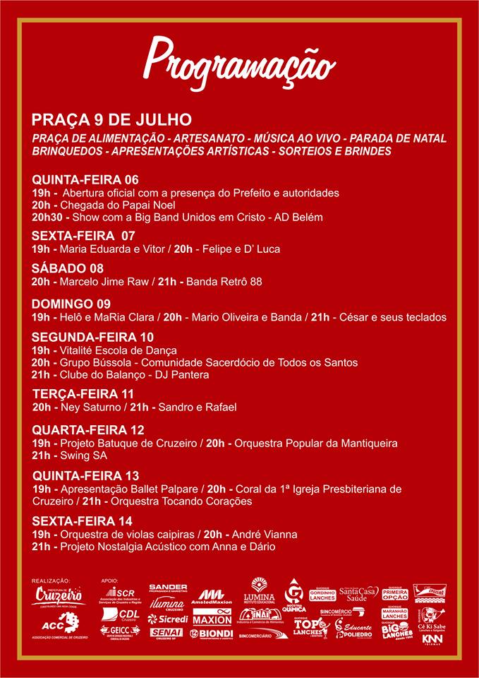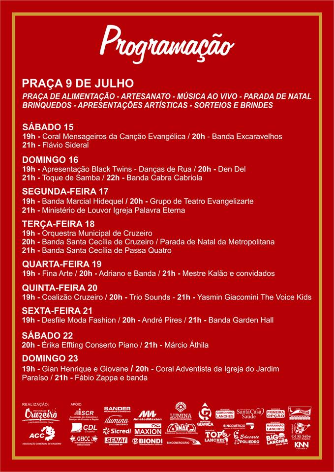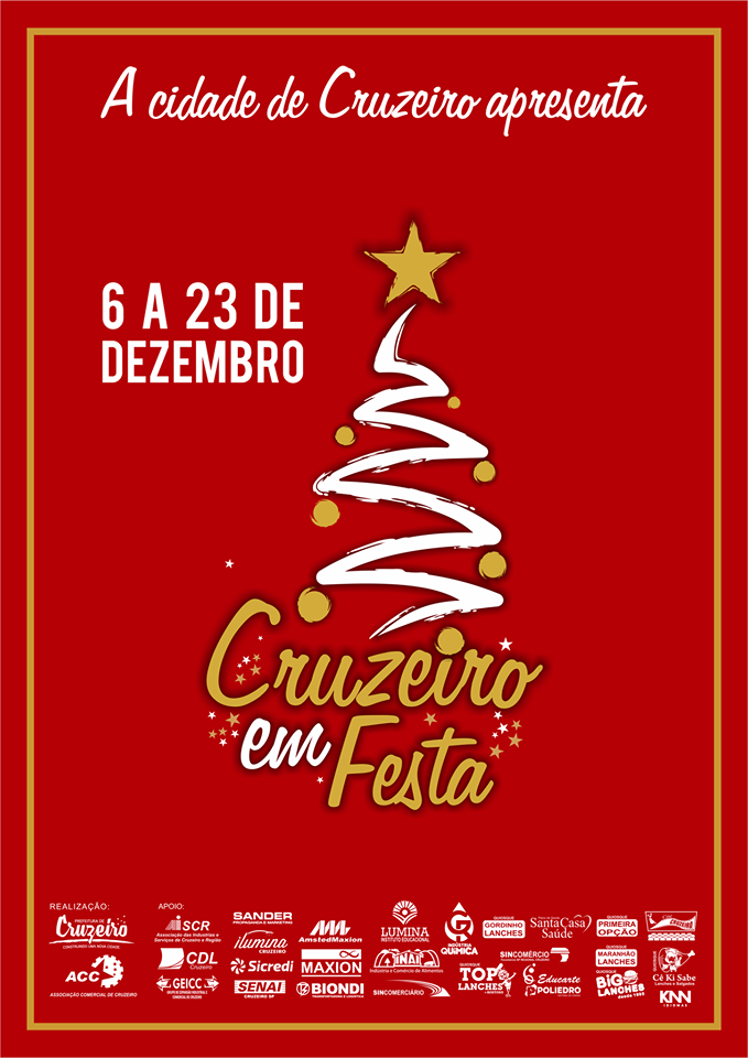A prefeitura e a Associação Comercial de Cruzeiro (ACC) estão preparando a 2ª edição do “Cruzeiro em Festa” com várias atrações de 6 a 23 de dezembro. A Praça 9 de Julho está sendo decorada com enfeites natalinos e iluminada para receber apresentações de música, teatro, dança, coral, orquestra e sorteio de brindes.