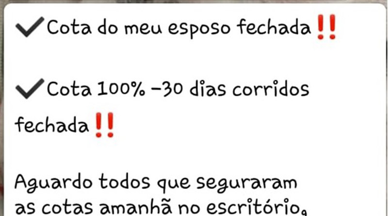 O chamado ‘acordo comercial’ entre as partes era feito por meio de contrato, com data prevista de pagamento da lucratividade. Algumas das vítimas contaram que chegaram a ter parte do retorno dos valores prometidos na data combinada, mas ao tentarem resgates adicionais, a empresária fazia uma nova oferta de investimento, o que na prática era o suposto ‘reinvestimento do valor’.