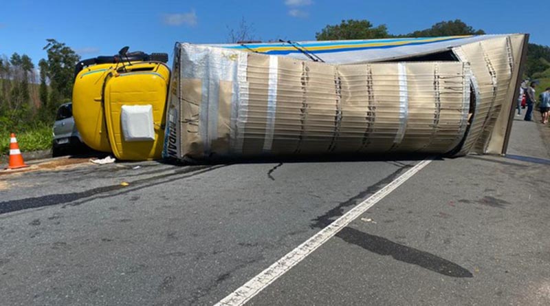 O motorista disse que o caminhão apresentou problemas nos freios e ele perdeu o controle da direção e tombou na rodovia, que liga Cruzeiro a Passa Quatro (MG).